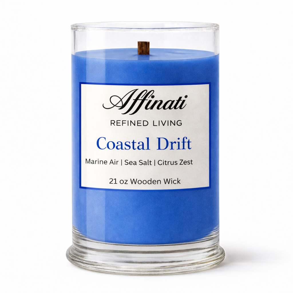 Embrace serene coastal luxury with the Affinati Coastal Drift Wooden Wick Candle – 21 oz, a large-format statement candle inspired by open horizons, crisp sea air, and the calming rhythm of the coast. Hand-poured into a sleek glass vessel, this candle is crafted from our premium soy wax blend for a clean, even burn. The natural wooden wick releases a gentle, fireside-like crackle that creates a soothing, immersive atmosphere from the moment it’s lit.