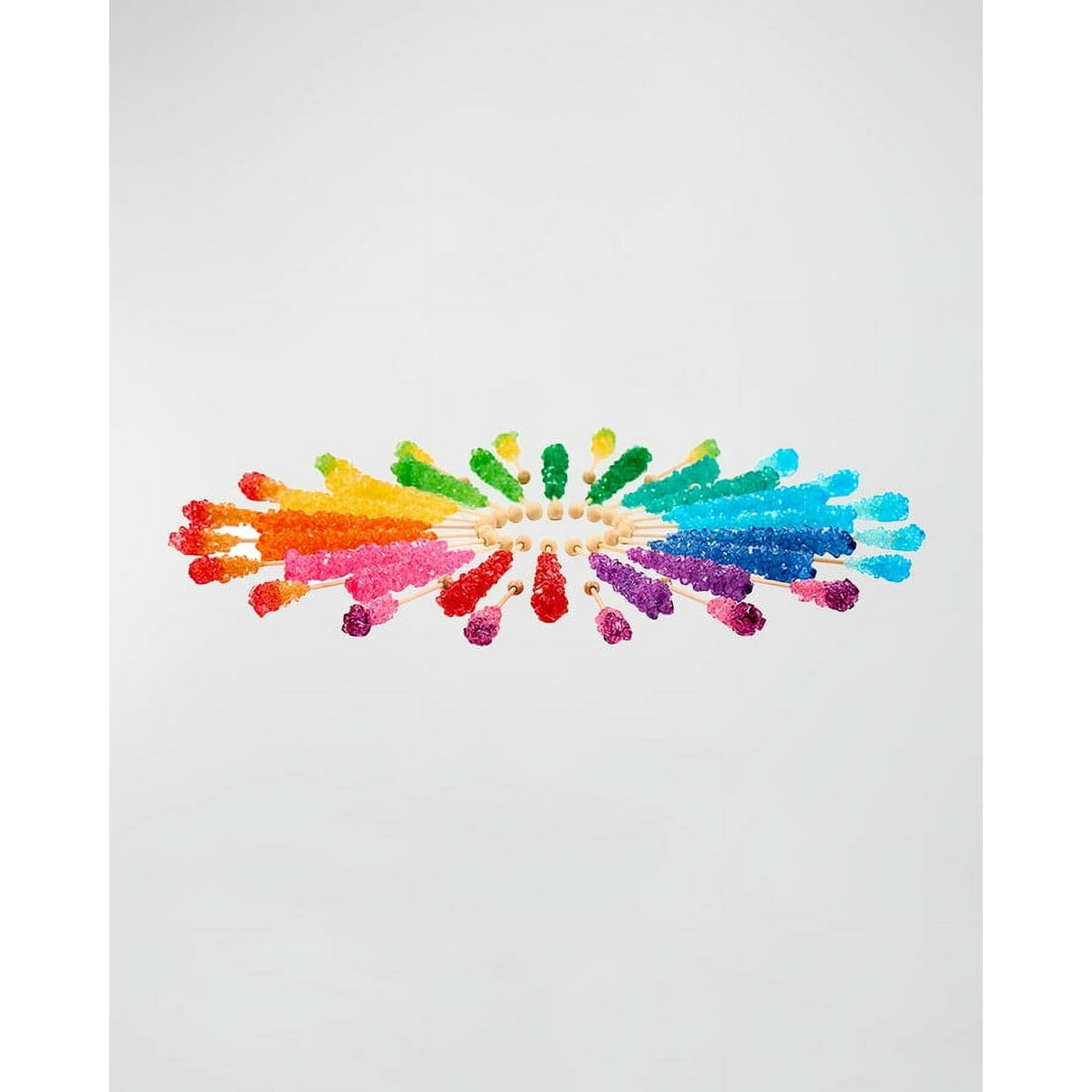 This vibrant 18-inch rock candy wheel features 20 crystal candy sticks arranged in a colorful circle. Enjoy two sticks each of cherry, pink cotton candy, orange, pineapple, green apple, blue cotton candy, blueberry, blue raspberry, and grape flavors. Perfect for sharing or brightening up any celebration with a playful burst of sweetness!